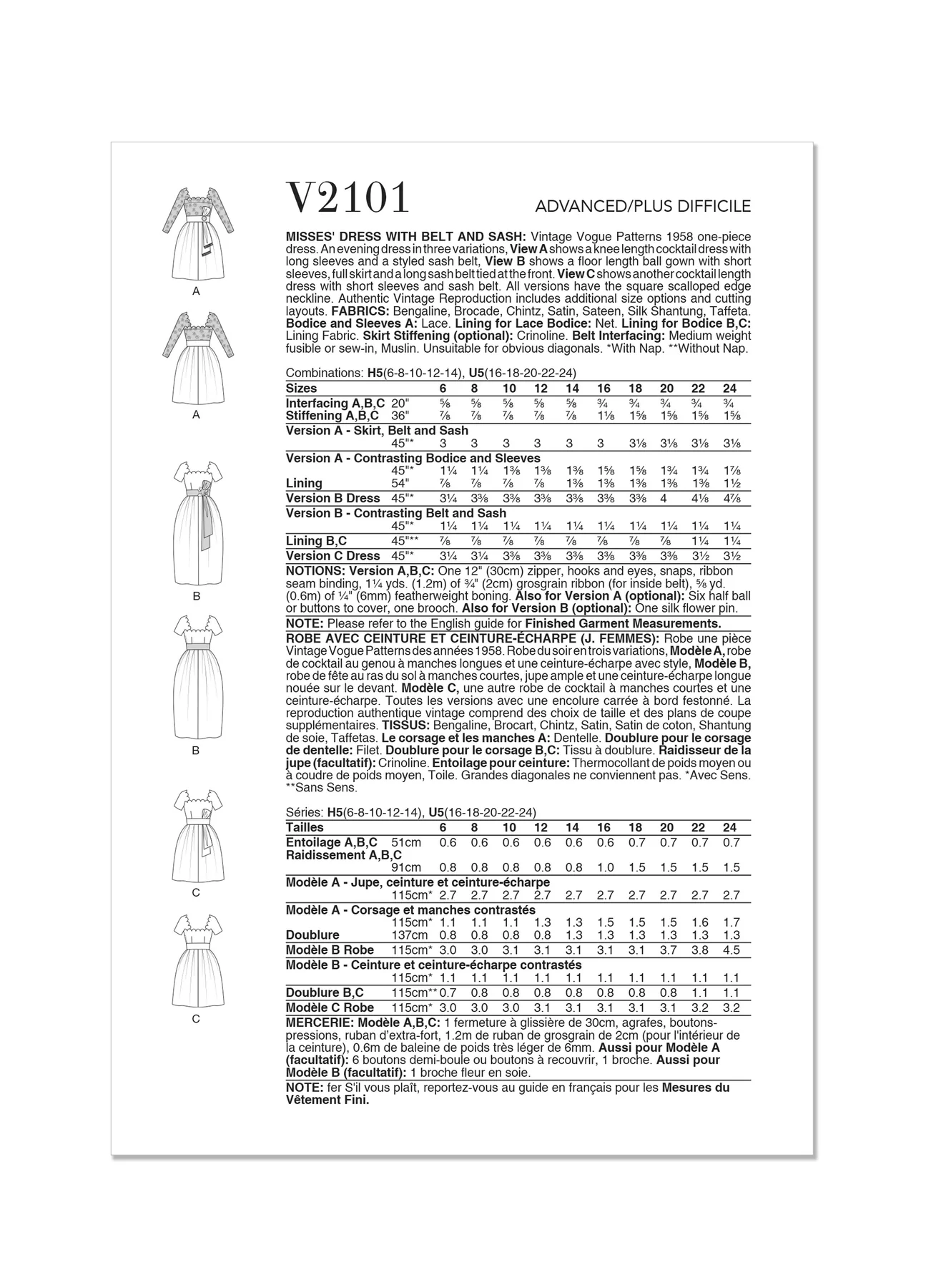 Vogue Pattern V2101 Misses' Dress with Belt and Sash