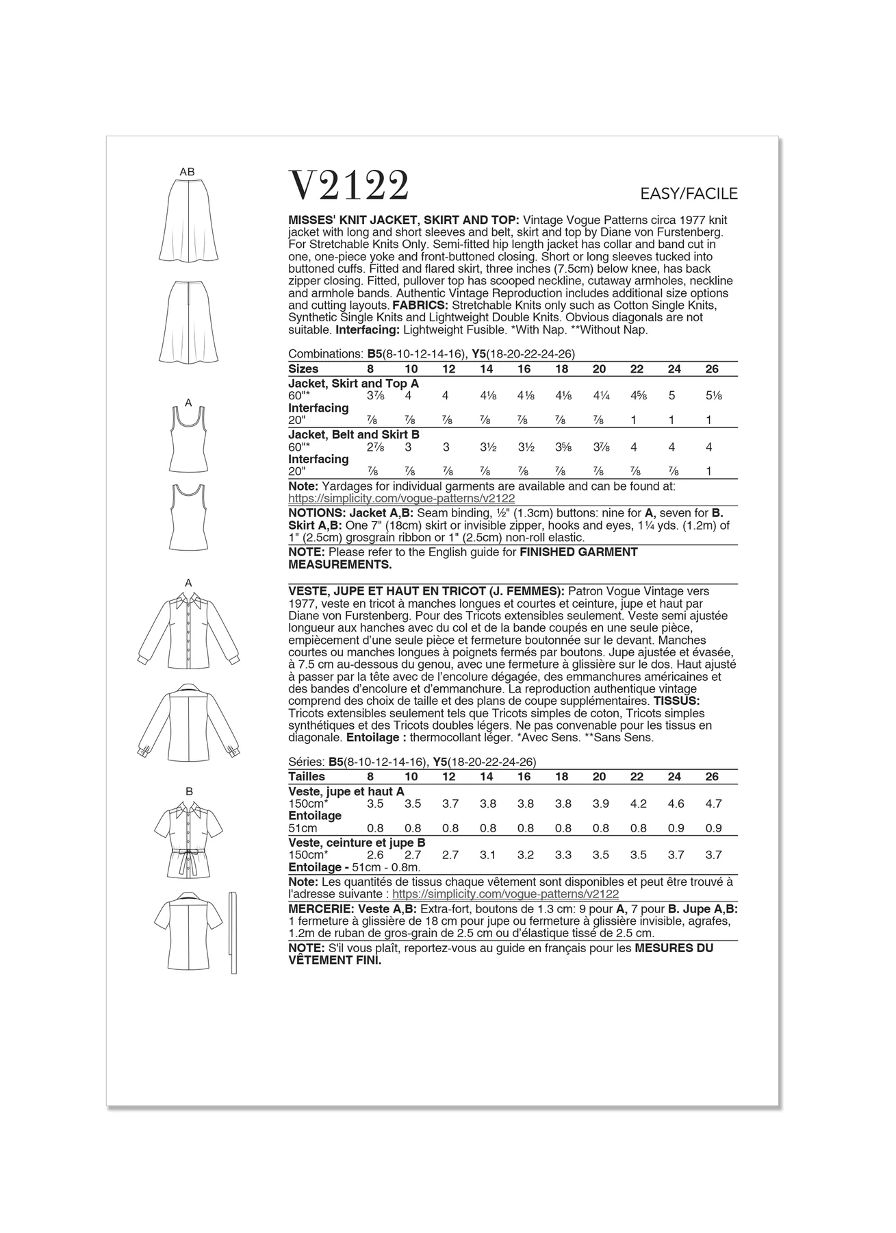 Vogue Pattern V2122 Misses' Knit Jacket, Belt, Skirt and Top